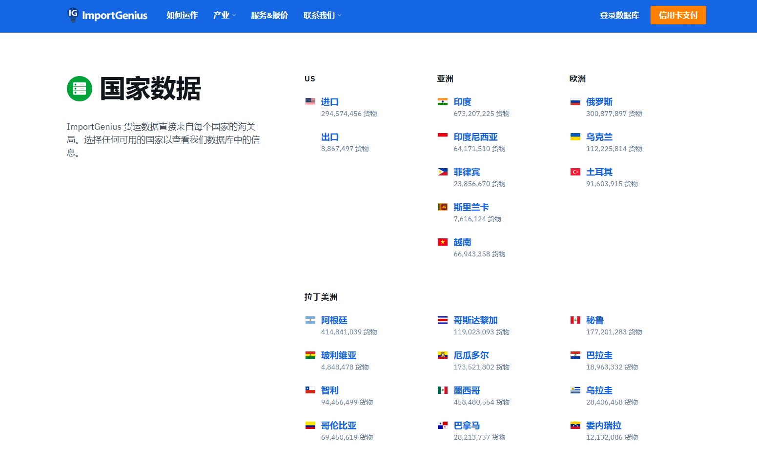 ImportGenius提供全球19个国家的海关数据,主要侧重于美国市场和美洲地区的海关数据,尤其擅长提供美国海关数据,并且也涵盖一些其他地区(如拉美、亚洲等)的进出口信息。由于其数据覆盖范围较少,其不提供全球市场分析,只提供单个国家市场分析。ImportGenius更适合那些已经有固定出口市场、需要在当地扩大客户规模的企业。